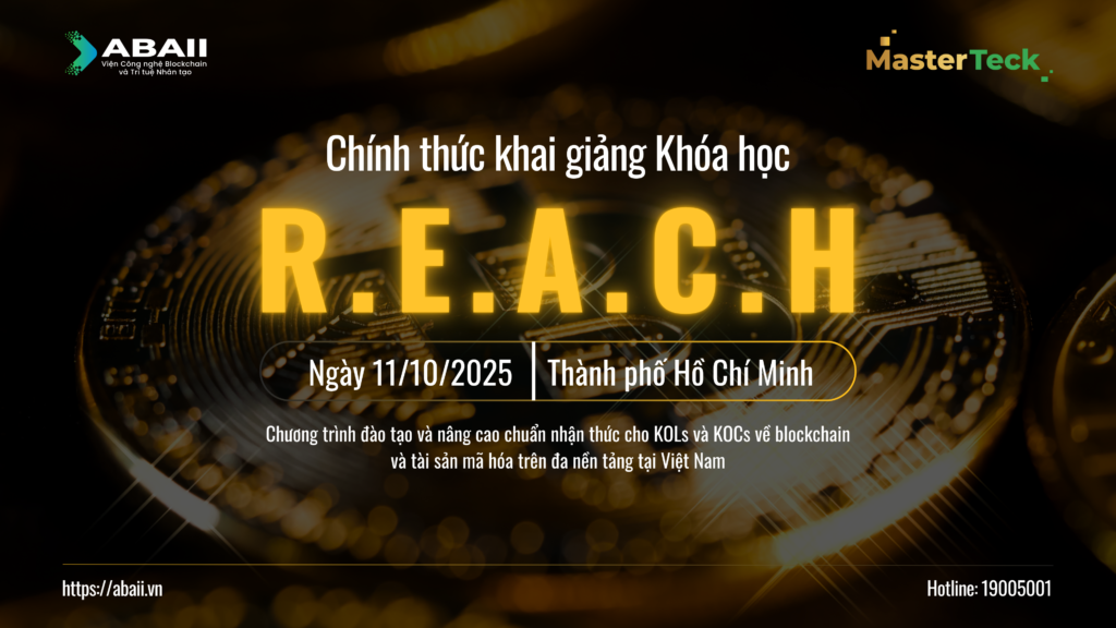 Ngày 11/10/2025, Viện ABAII chính thức khai giảng khóa học R.E.A.C.H – Chương trình đào tạo & nâng cao chuẩn nhận thức trong hoạt động truyền thông, affiliate về Blockchain và tài sản mã hóa trên đa nền tảng. Đây là chương trình đầu tiên tại Việt Nam được thiết kế chuyên sâu, hướng đến mục tiêu chuẩn hóa kiến thức, đạo đức nghề nghiệp và khung pháp lý cho những người tham gia truyền thông trong lĩnh vực tài sản số.